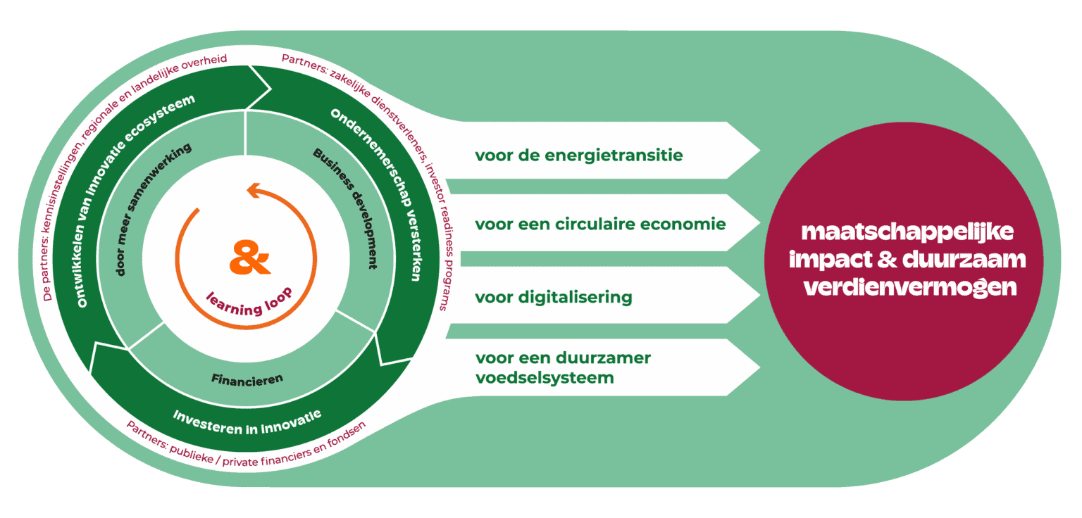 Innovation comes from entrepreneurship, knowledge, money and a network. That is why we are open to others and want to learn continuously. We operate transparently and in close cooperation with regional businesses, knowledge institutions and governments to achieve results quickly and effectively.